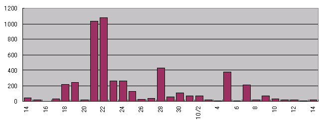 ![]() 2002年福岡 片江展望台 タカ類通過羽数の推移