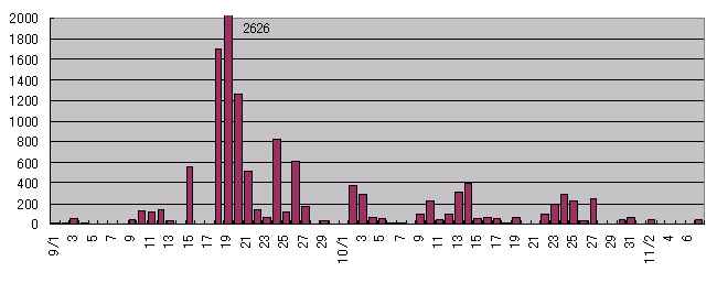 ![]() 2002年白樺峠 タカ類通過羽数の推移 | ||||||||||||||||||||||||||||||||||||||||||||||||||||||||||||||||||||||||||||||||||||||||||||||||||||||||||||||||||||||||||||||||||||||||||||||||||||||||||||||||||||||||||||||||||||||||||||||||||||||||||||||||||||||||||||||||||||||||||||||||||||||||||||||||||||||||||||||||||||||||||||||||||||||||||||||||||||||||||||||||||||||||||||||||||||||||||||||||||||||||||||||||||||||||||||||||||||||||||||||||||||||||||||||||||||||||||||||||||||||||||||||||||||||||||||||||||||||||||||||||||||||||||||||||||||||||||||||||||||||||||||||||||||||||||||||||||||||||||||||||||||||||||||||||||||||||||||||||||||||||||||||||||||||||||||||||||||||||||||||||||||||||||||||||||||||||||||||||||||||||||||||||||||||||||||||||||||||||||||||||||||||||||||||||||||||||||||||||||||||||||||||||||||