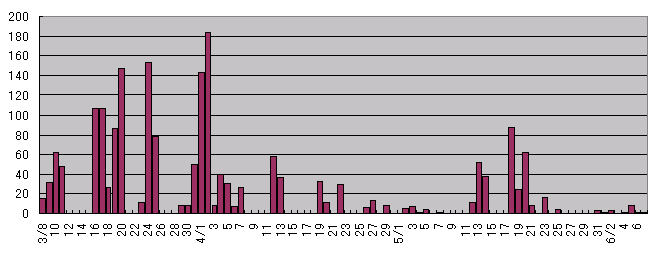 4/26 本日は晴で東よりの風が強い。いずれの個体も高空を飛翔しており発見が困難であった。本にも書いてあったが追い風の時は高空を飛ぶらしい。