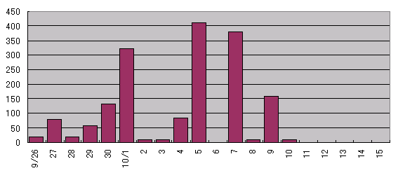 ![]() 2003年三重 伊勢市 タカ類通過羽数の推移 |