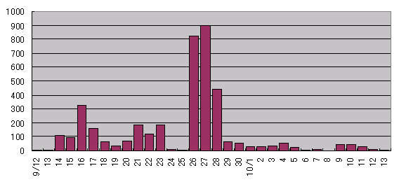 ![]() 2003年福岡 片江展望台 タカ類通過羽数の推移
