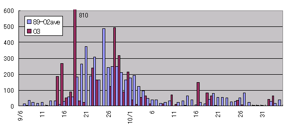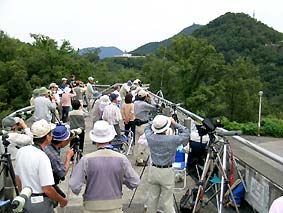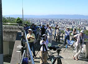 09/06 10:00ころにミサゴとツミがでましたが渡りという感じではありませんでした。(重栖) 09/07 発見が遅れあっという間に渡っていきました。帰り間際に地付きのオオタカ幼鳥が縦斑がはっきり見えるほどの低空を飛び、 一日の締めくくりとなりました。(重栖) 09/14 早朝曇天。11h頃から晴れ間が広がり台風一過。11hのタカ柱を合図に17hまで、秋空にタカの渡りが続く。(熊崎) 09/15 快晴だがモヤで伊吹山が見えない。雲一つ無い空が8-9hの間、次々と現れるサシバの大きなタカ柱で埋まる。ワーッ!調査初期にこんな歓声が出るのは初めてかもしれない。午後14h台は次々と高いがハチクマが続き、識別を皆で楽しむ。(熊崎) 09/16 イソヒヨドリ♂1渡り個体。(伊藤) 09/17 高温無風状態。靄で見通し悪く苦労する。早朝サシバ2羽のみで、9時より漸く渡り始め10時台がピークであった。午後からも、期待したほど渡らなかった。(林) 09/18 9:15に40羽のタカ柱が出来たのを皮切りに、20羽〜50羽のタカ柱が連続的に次々と雲の中から現れ、高度を上げてから流れ始める。これが帯のように10時20分まで続き、この65分間にサシバ663羽・ハチクマ28羽・の計691羽が通過した。 09/19 天候は午前中は雲が多かったが晴れ間もありましたが、午後になり曇り14:00頃からは大変暗くなり15:00で調査を終了しました。渡りは9:00-12:00までで、午後は1羽も飛びませんでした。(桑原) 09/20 11:30から雨となりその後中止。サンショウクイS1、ハリオアマツバメ12、イワツバメ30±(福井) 09/21 台風15号接近中、雨の中でもタカの渡り観察会を実施。総勢10名ほどの参加。雨の中サシバ1通過。(酒井) (定点が市街地に近く、展望台の下で雨宿りも可能!チョットホークウォッチングができる金華山ならではの観察会。) 09/22 視界40km 伊吹山や名古屋市内もで綺麗に見える。明け方から晴れ、8時までは長袖の上着がないと寒い。タカの高度はとても高く、双眼鏡でないと見えない高さがほとんどだった。8時から飛び始めたが、15時台で一日の半数が通過した。(酒井) 09/23 台風後の祭日。WBSJ愛知県支部探鳥会もおこなわれ展望台は63名で賑やか!金華山では珍しくサシバとハチクマの割合がほぼ同一。12:51のハチクマだけのタカ柱には圧巻!(熊崎) 09/24 しばらく雨の様子を見ていたが、降り止まず雨天中止とした。(戸田) 09/25 終日降雨のため調査不能でした。(林) 09/26 早朝、朝霧で岐阜市内は雲海のようで美しい。(湿度が高く、早朝の低温により霧が発生)(桑原) 09/27 快晴の空で始まった見づらい一日。午後に大きなサシバのピーク。ハチクマの数も多く識別がとっても楽しい一日。(熊崎) 09/28 早朝サシバがまとまって出現。低い位置を飛ぶ。8h頃からサシバに換わってハチクマ、ノスリがパラパラと出る。タカ柱ができるようなまとまった数は出なかった。カケスが出現し始めた。(大塚) 09/29 本日はたいへん風が強く、半袖では翌日の勤務に支障を来します。ご注意!でも大気の透明度はたいへんよく、名古屋市は臨海部までよく見えました。ホークウォッチングの閑なときはエアプレーンウォッチングでした。(伊藤) 09/30 早朝から快晴で風が強く寒さを感じた。50羽程のアトリの群れが上空を通過。漸く秋の深まりを実感した。サシバは、早朝6時台と14時から16時に集中、ノスリは終日平均して通過した。(林) 10/01 今日は、数も少なくサシバの渡りも終盤を迎えた感じだ。午前中晴れたが無風状態でサシバは羽ばたきながら上空を通過した。午後は、曇りとなりほとんど飛ばなかった。(広瀬) 10/02 11時30分にツミ1とチョウゲンボウ1、14時台にサシバ5、ノスリ1、ツミ4が飛ぶ。(大橋) 10/03 早朝は曇っていたが、急速に晴れ間が広がる。昼頃から北風が強くなり、さわやかな反面、夕方は日が陰ると肌寒い。本日の唯一のハチクマjuvはそのうがふくらんでいた。ヒヨドリの渡りが797羽と盛ん!(熊崎) 10/04 早朝の雲が今日も急速に回復し、巻積雲が広がる美しい秋空。空高くノスリ、ツミが通過し、チゴハヤ、ハヤブサが華麗な舞いで今日のフィナーレを演出。(熊崎) 10/05 やっぱり少ない。高度は高いが許せる範囲。タカも少ないけどウオッチャーも少ない。これからはノスリのシーズンって感じ。まだまだ楽しめそうです。県支部としての定期観察は今日でおしまい。また来年会いましょう。これからは有志による調査となります。(酒井) 10/10 実質11:20−50分に66羽飛びました。旋回せずに殆ど通過しました。(桑原) 10/11 朝から曇で一時的に青空が少しでるが、すぐに雲が厚くなり、14hには伊吹山も見えなくなる。15hに中止とした。(熊崎) 10/13 朝から豪雨。レーダーエコーを参考に、12:00より調査を開始した。雨が上がったあとは急速に秋空が広がり、北風が次第に強くなる。(熊崎) 10/16 早朝は風が弱く、9-11hの間に多くのノスリが通過する。ヒヨドリの渡りも今だ盛んで、アサギマダラも通過。1頭ズボンからヤッケにかけて擦り寄ってきたアサギを手で捕獲。今だかつてこんなになれなれしい個体は経験なし。素手でそ