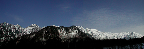 | 3/31 早朝快晴の空、白銀の山並み沿いにサシバが通過。(左から錫杖岳、笠ヶ岳、抜戸岳) | |