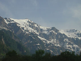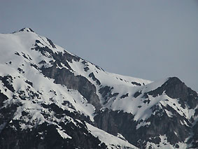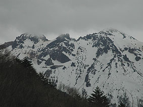 | 5/17 青空の笠ヶ岳。さらに雪が少なくなり周りは新緑 | 午後は積雲に頂上が隠れる |