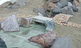 ![]() ・湯の花が一面。湯中には竹踏みもある。 |