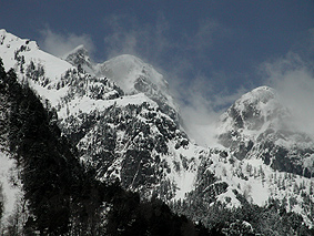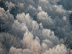 | 4/10 朝の霧氷がかかる木々が美しい | ガス沸く岩峰(笠ヶ岳) |