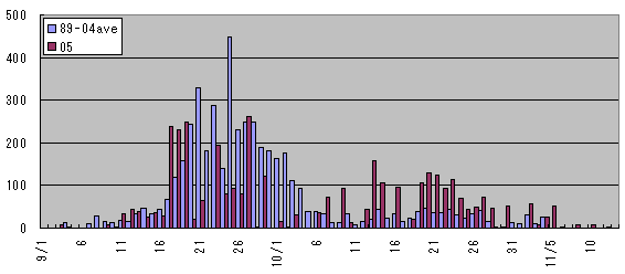2005年の金華山タカ類渡来羽数の推移状況 9/1-11/13 (参考 逆行個体含まず)