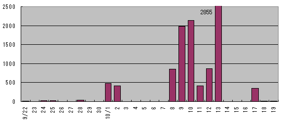 10/13 8:30以降11:30までに観察した個体約600+-羽は渡らず引き返した。上記のカウントは熊本県支部の高山、中原、高橋、山本、白石様のご協力を得ました。 |
