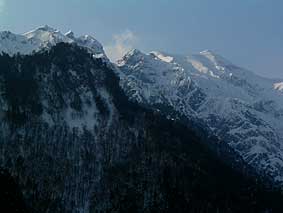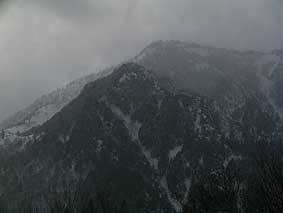 4/03 昨夜からの雨が止まず、山々は厚い雲に覆われたまま。雪が多く残っているが、木々は枝先が赤みががり、新芽の準備ができているようす。 (小森N)