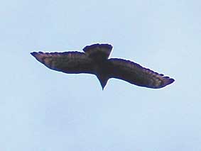4/06 今日はノスリ1羽かと思い、帰ろうとすると、頭上高いところに8羽のタカ柱。流れたと思ったらまた双眼鏡に9羽の群れが入る。その下をノスリが横切るが、時間がない。後ろ髪引かれる思いで仕事に戻る。(住)