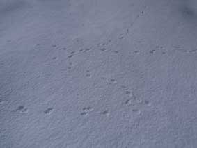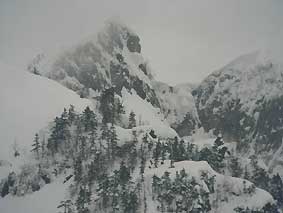 4/01 全て笠ヶ岳の稜線沿いに渡って行きました。昨日降った20センチ程の新雪の照り返しと、霞がかった空で発見するのに苦労しました。(住)