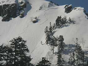 | 3/25 表面が溶け凍った、雪面のダイヤモンド? | 3/25 表層雪崩跡 雪面の表面だけが崩れている |