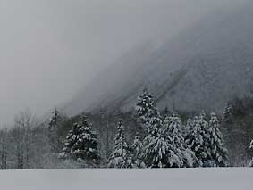 | 3/18 中尾温泉「足洗の湯」 7h頃は晴 | 3/18 11hにはガスがかかる山稜 |