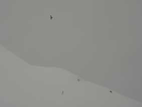 4/09 今日もまた10cmの新雪。天候回復が遅く青空が見え始めたのは15h頃。朝一番からサシバ、ノスリが地吹雪が舞うガスの北アルプスへ。(熊崎)