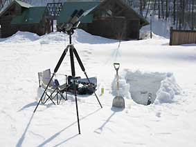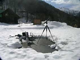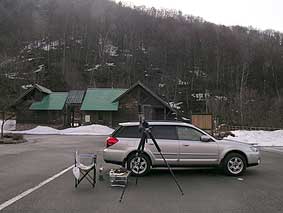 3/11 1日快晴。例年より早く入ってみたが、渡り個体0.ただ、帰宅途中、栃尾、平湯、高山市内でも数羽のノスリを確認した。雪は多く凍結路を走ってきたが、昼間は春の陽気。朝の硬い雪がくさり、三脚が沈むためやむ終えずアスファルトが出るまでの調査スペースを掘り確保。(熊崎)