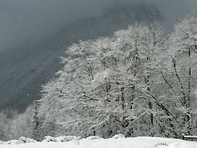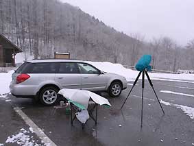 4/01 定点は50cm以上の積雪。当然、入る事もできず、路肩も無理。仕方なく中尾に車を停めてみたのですが、地吹雪と吹雪とガスで断念。(住)