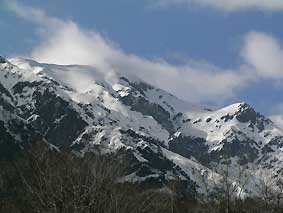 4/04 早朝は10cmほどのカチカチの残雪上で調査開始。いきなり7:30に錫杖岳北にサシバ15羽のタカ柱。高度も高い。山がうなる風音が午前中続く空を、軽快にサシバが通過。次々に笠ヶ岳から湧き出す雲は形が早い速度で変化し美しい。午後は雲が広がり、通過個体も少なく調査終了時点には暈がでる。(熊崎),住
