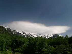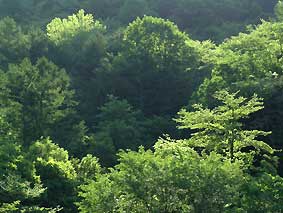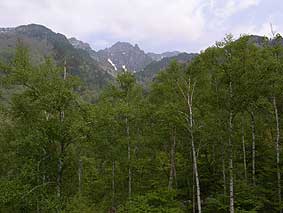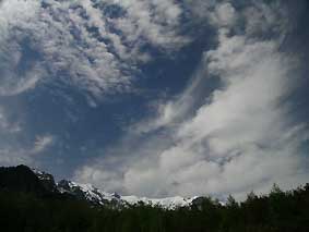 | 5/26 早朝、笠ヶ岳上空にでた雲 | 5/26 朝日に浮き上がる色濃くなった若葉 |