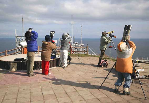 05/18 今日はガスが出てしまったので見落としはかなりあると思います。(吉岡) 05/17 龍飛崎調査再開(吉岡) 05/04 早朝は雲に切れ間もあったが、天気は下り坂。今日もマヒワがたくさん渡ってゆく。連続調査はこれにて終了。おかげさまで収穫の多いシーズンでした。(久野) 05/13 カモメも苦戦ぎみの強い東風。ちぎれたカエデの若葉が空に舞う。ノスリとハイタカが少しも海に出られない中、ツミは岬の乱気流にもまれながらも躊躇することなく沖へと向かう。さて、ハチクマは???。賢い彼らはこんな日は安全な山で待機かと思いきや、力強くはばたいて、横風に流されることもなく普通に渡ってゆく。ハチクマファンの私にとって感動の光景でした。(久野) 05/12 今日もカラリと晴れわたる。タカを見落とすまいと頑張ったのだが成果はいまひとつ。8時半頃、昨日の親子とおぼしきクマタカ2羽が南へと飛び去るのを見る。めでたしめでたし。(久野) 05/11 秋のようなさわやかな空から強烈な紫外線が降りそそぐ。昼前になんとクマタカ親子が岬に飛来。調査地すぐ西のヤブに下りてしまった子供がとり残され、カラス軍団に囲まれるハプニング。2時間近く、岬でひとり寂しく過ごした後、よたよたと飛んで、どうにか自力で山の方へと帰って行った。5時前に渡ったヘラサギも、ハチクマ初認のことも忘れてしまう珍事件。( 久野) 05/10 寒に震えるほどの曇りの朝も、だんだん青空が広がり、昼間は暖か。昨日からマヒワが好調。弾ける群れは見ていて楽しい。午後は収穫なく虚しく空を眺める。(久野) 05/09 今日もよく晴れるが、相変わらず風は冷たい。小鳥、タカともに在庫切れの様子。そろそろあのタカが現れるはず、と、いつもは目への負担を軽減するためにほとんどチェックしない、眩しい南側の空も双眼鏡で丹念に探るが、まだお目にかかれず。明日かなあ。(久野) 05/08 今日も西風が冷たいが日差しは強く、身体には厳しい一日。久々に小鳥たちが岬に戻って、午後も賑やか。終日、若いノスリたちが点々と渡ってゆく。戻りも多く、撮影日和り。(久野) 05/07 西風が吹いて寒い。ツミの動きが活発になってきて、渡りの主役に。今日も若鳥を数個体確認する。換羽は様々な段階のものがいて、おもしろい。(久野) 05/06 強い西風。昨日夕方からの雨は止んだものの、暗い雲が残り、小鳥の声はない。タカの動きもあまりなく、ただ風の音を聞いていると、ひと月ほど前のような気分になるけれど、岬のカエデは青々と葉をしげらせ、足元にはかわいらしい花がいろいろ。景色の中にツツジの赤も目立つようになっている。(佐伯) 05/05 東風。昨日までは見かけなかった小鳥が早朝、あれこれ姿を見せてくれたが、渡りの気配はなし。夕方前には雨本降り。朝には上がるとの予報に期待。(久野) 05/04 東風が強いものの、まずまずのお天気。なのにタカも小鳥もさっぱり現れず。まさかと思うほど退屈な一日。(久野) 05/03 朝のうちは霧に包まれてしまい、小鳥の渡りは楽しめなかったが、日中はよく晴れて汗ばむ陽気。ヒマな時間帯もあったものの、ノスリが頭上近くを7〜8羽で旋回するシーンでは、見物客が大いに盛り上がる。(久野) 05/02 穏やかに晴れてポカポカ陽気。視界はあまり良くないが、ノスリもハイタカも戻りが少なく、調子よく渡ってゆく。どちらもほとんどが昨年生まれの若者たち。見慣れぬ羽色の個体も撮影でき、今日も収穫あり。(久野) 05/01 南西風の強い晴天。ツミが何度も低く飛ぶので気が抜けない。終了後、♀若鳥2羽の写真が検出される。ずっと探していた我々にとってこれは大発見。またも祝杯です。(久野) 04/30 穏やかな朝。海上に霧がかかって視界が悪いせいか、タカは姿を見せない。にぎやかだった小鳥たちは、早くも5時には高くなってしまう。岬にはモズが何羽も降りていて、旅の途中という風情。今朝はツグミがたくさん飛んだので、夕陽を見がてら、夕方も調査。日没後、期待通りツグミの群れが渡っていき、暗くなってからも小鳥の声が続く。気持ち悪いくらい暖かい風。(佐伯) 04/29 南西の風。暗いうちから鳥たちの気配が濃厚で、何日ぶりかの活気ある朝。耳元をヒガラが通りぬけ、ヒガラを握ったハイタカはすぐ隣を這うように飛んでいく。ノスリはすっかり幼鳥ばかり。午後になってもカラの群れがにぎやかで、夕方までの調査が全く苦にならない。(佐伯) 04/28 風は一向に弱まらず、猛烈な西風が続く。とてもタカが飛んでくるような状況ではない。海にはミズナギドリがいっぱい。いつ見ても、ざらざらと。(佐伯) 04/27 夜明け前から降ったり止んだり。すっかり雨雲が消えて青空が広がる時間もあり、くたびれる天気。ノスリはほとんど出てこないが、ひょいと飛び出すタカを見れば、ハイタカ、オオタカの他にツミの姿も。南西の風が次第に強まり、昼頃からは風速20メートルを超える猛烈な風。(佐伯) 04/26 昨夜はかなり冷え込んだが、風もなく穏やかな朝。ハイタカが調子よく飛び、カラ類をつ