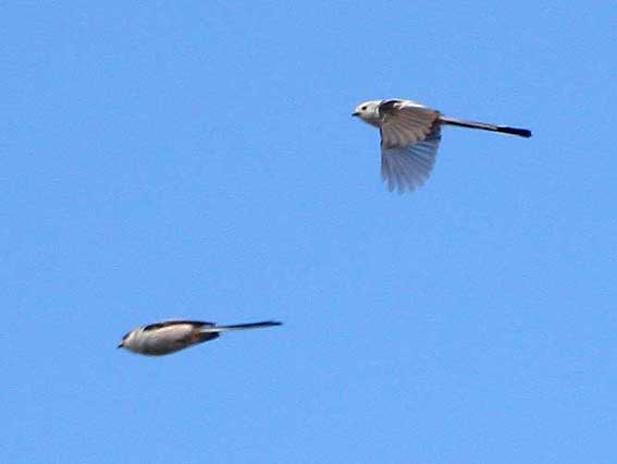 | <シマエナガ> 当地では、ほぼ毎年確認されているが、今年は特に記録が多い。左下は普通のエナガ。 |