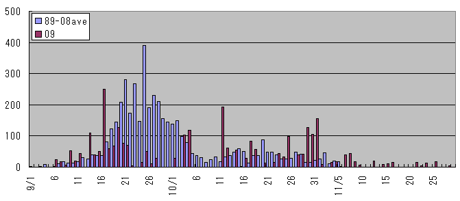 2009年の金華山タカ類渡来羽数の推移 9/01-(参考 逆行個体含まず)