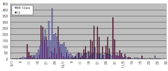 ![]() 2013年の金華山タカ類渡来羽数の推移 9/01-11/16(参考 逆行個体含まず)