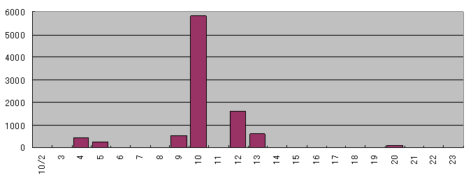 10/02 午前中は日がさす時もあったが、14時過ぎより本格的にくずれる。渡りと逆方向の南西風がほぼ1日中吹き、最悪の状況となる。 10/03 朝から曇り、14時過ぎよりくずれる。15:00より風も止み、16:00に調査打ち切り。風は地上では東、上空では南西。 10/04 終日晴れで、東の風。12:30より14:00の間にピークが来た。14時以降はピタリと止まる。 10/05 午前中は戻る動きが見られたが、13:30より動きが逆に変わり渡る。強めの東風が終日吹く。 10/06 朝より曇りで、13時より雨。14時に調査打ちきり。東の風が強く、気温が下がった。 10/07 朝より激しい雨が断続的に続く。10時に調査打ちきり。 10/08 昨晩からの雷雨が残り、降ったり止んだりを繰り返す。11時に雨が激しくなり調査打ちきり。 10/09 10時台と13時台にピークが来る。いつもより出現が早い。上空で風が様々な方向からぶつかり合っていた。 10/10 9時から出現がはじまり11時台から13時台にピークが来る。いつもとは桁違いの数が出現した。出現中はサシバが途切れることがなく、川の流れのようであった。 10/11 午前中にごく少数の渡り。天候と風は安定していた。 10/12 朝より晴天。13時〜14時台にピークが来る。午前中は風が悪いのか、はばたく個体が多かった。 10/13 終日晴れで、風は穏やか。11時台〜12時台にかけてピークが来る。14時以降ピタリととまる。 10/14 終日晴れて風は東より。本日は屋久島南西部の栗生の定点で、屋久島の西を渡ってきたと思われる1255羽のサシバを確認した。尾之間の確認数とは対象的であった。 10/15 風は良かったのだが天候が悪く、確認数自体少なかった。出現した個体も本来の渡りとは逆方向に飛翔していた。 10/16 天気は良いが終日風が強く、出現が少ない。15:30で調査打ち切り。 10/17 天気は曇り。終日渡りに無関係な動きが続く。 10/18 朝より小雨。10時より雨が強くなり視界も悪くなったため、調査打ち切り。 10/19 終日雨が続く。風は北東で強く吹いた。 10/20 天候は晴れだが山には常に雲がかかっていた。風は午前中は西、午後からは東。 10/21 終日晴れだが、山には雲がかかり視界が悪い。吹く風は涼しさを増してきた。 10/22 朝のうちは山に雲がかかっていたが、その後かかることは無かった。終日風が強かった。 10/23 終日晴れだが、山には雲がかかる。本日で全調査日程が終了。 |