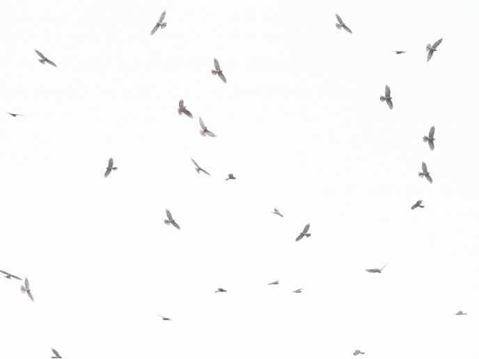 | 都農町 牧内山は標高200m程の丘陵地です。都農町の街を眼下に見下ろすことができる、見晴らしの良い場所のため、町の自然公園施設やワイナリーがあり、たくさんの人が訪れる山です。頂部には美しい茶畑や牧草地、ブドウ園や自然林が広がっています。観察地は茶畑の中の道路脇で、通過するサシバの群は牧内山(201m)と西側にある尾鈴山(1,405m)系の畑倉山(849m)や戸矢山(548m)との間を通過するものが多いのですが、時には調査地上空や少し東側を通過する群もあり、双眼鏡がなくても楽しめる時もある素晴らしい観察地です。 | ||