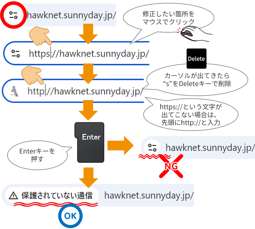 “https://”の“s”の部分をクリックします - “s”の文字をDeleteキーで削除します