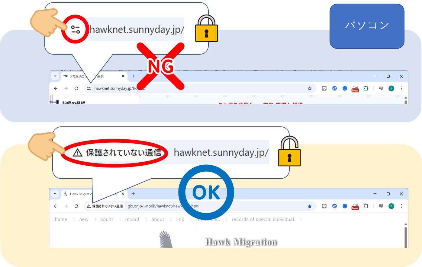 図:PCでのhttps(上段)とhttp(下段)でのマークの違い