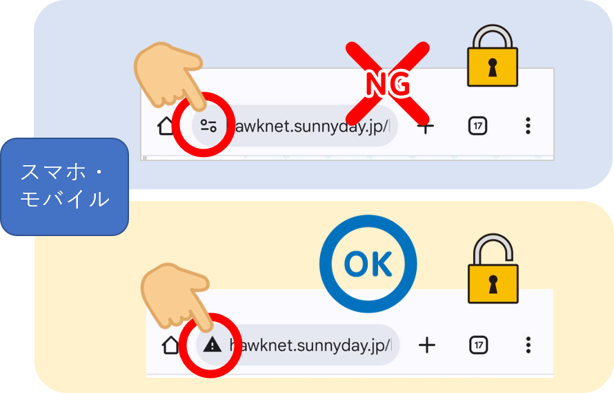 図:スマホでのhttps(上段)とhttp(下段)でのマークの違い