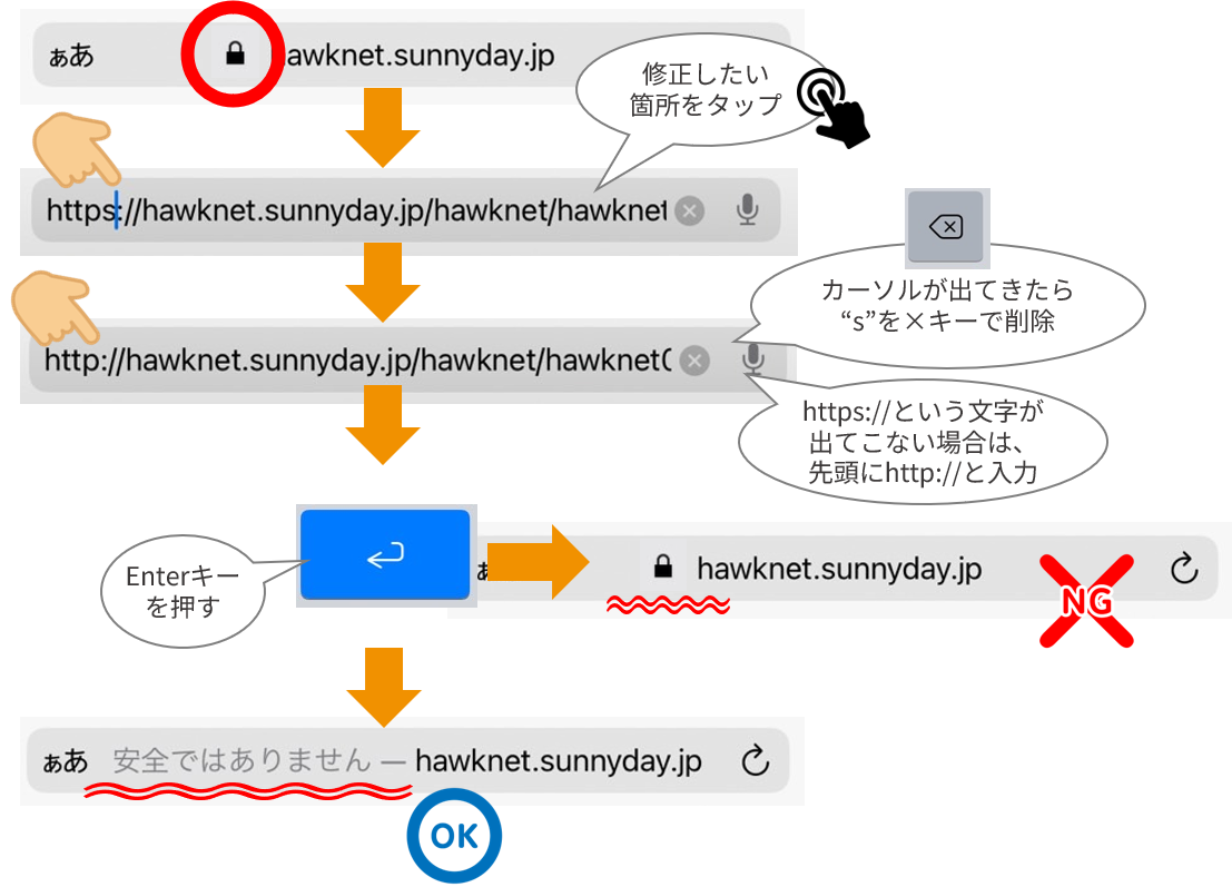 “https://”の“s”の部分をタップします - “s”の文字を×(Delete)キーで削除します