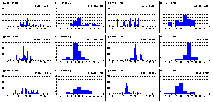 | グラフ1(時間帯別 :ピーク日) 左:10分 右60分 刻みを変えると感じが違う ↑ ↓ top end |