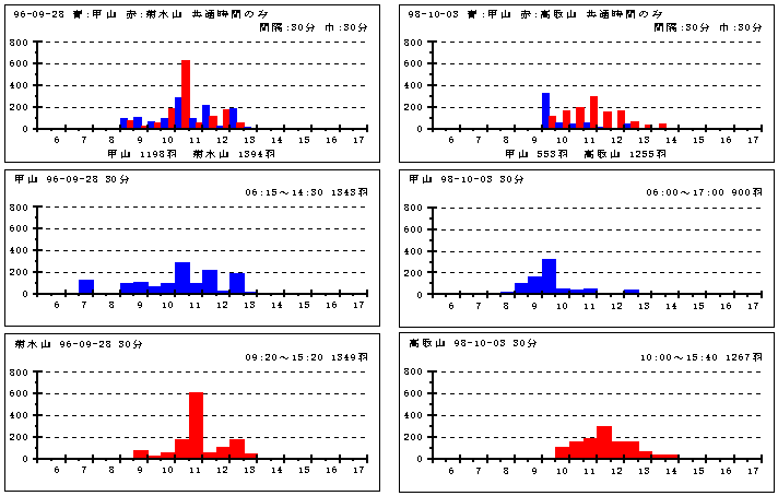 | グラフ2(2地点の数) | 1日の総数は同じでも時間で見ると違うものを見ていることが歴然。 ルート・コースの違い、それとも見逃しか。 直線距離 甲山-菊水山 18Km 甲山-高取山 21Km |