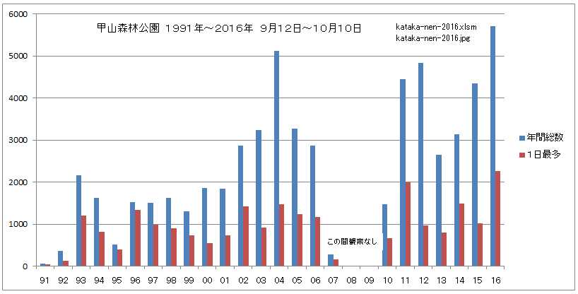 | 場所 | 甲山北の尾根のみ | 甲山一帯の合計重複除く主に尾根・展望台、他に五ケ山・南ポイント・北山ダム 日によって不定 観察条件(場所・時間)が日によって異なるので数字のまま読み取ることは不可です 数が空白の日は観察していない。 | |||||||||||||||||||||||||||||||||||||||||||||||||||||||||||||||||||||||||